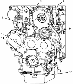 將適當?shù)钠鸬踉O(shè)備連接在前齒輪室 (10) 上。 前齒輪室 (10) 的重量約為 57 kg (125 lb)。 拆卸螺栓 (11) 。
