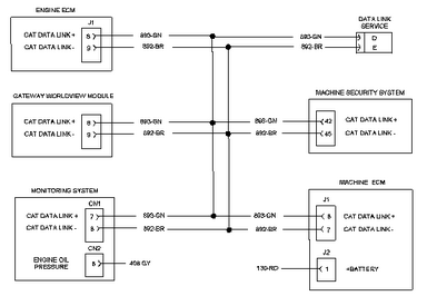 在監控系統 ECM 的機器線束上,測量機架接地與 Cat 數據鏈路接頭觸點 J1-7(導線 892-BR)和 J1-8(導線 893-GN)間的電阻。
