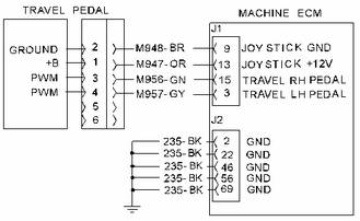注: 左履帶行駛位置踏板傳感器為 PWM 傳感器。 如果傳感器電源出現故障,PWM 傳感器將設定 FMI 03 代碼。 檢查 CID 0467 FMI 03 是否隨 CID 0466 FMI 03 代碼一起存在。如果存在,則執行測試步驟 1。 如果不存在,則跳過測試步驟 1 而執行測試步驟 2。