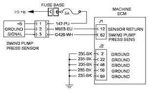 該診斷代碼與回轉(zhuǎn)泵壓力傳感器有關(guān)。 FMI 03 表示機(jī)器 ECM 已確定傳感器輸出信號(hào)電壓高于正常值。