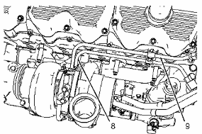 從渦輪增壓器上拆卸冷卻液供應管(8)和冷卻液排放管(9)。檢查管路內是否堆積有碎屑或污染物。如果發現管路內有碎屑,確定污染物的來源。必要時修理冷卻系統。