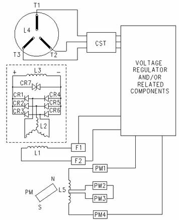 PMPE 發電機配線圖 (CR1 至 CR6) 整流器 (CR7) 變阻器 (L1) 勵磁機磁場(定子〕 (L2) 勵磁機電樞(轉子) (L3) 主磁場(轉子) (L4) 主電樞(定子) (L5) 副勵磁機電樞 (PM) 永久磁體 (RFA) 旋轉磁場總成 (CST) 客戶提供變壓器 (T1, T2, T3) 發電機端子及/或發電機引線 |