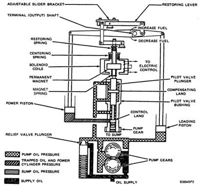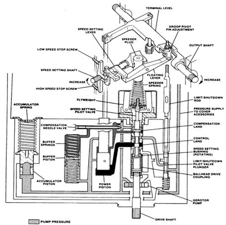 動力活塞同傳動器的終端(輸出)軸相連,發(fā)動機的燃料架聯(lián)動裝置也與終端軸相連。當(dāng)發(fā)動機的負載發(fā)生改變時,動力活塞的運動會轉(zhuǎn)動終端軸,聯(lián)動裝置將使燃料架移動到新的設(shè)定之上,從而與新負載條件下的發(fā)動機速度保持一致。