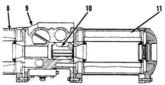 在進行普通操作時,控制閥應(yīng)位于“主運轉(zhuǎn)”位置。潤滑油將通過主過濾倉(1)中的主過濾管(8)流出,過濾后的油會經(jīng)檢驗閥(10)向右流并阻塞輔倉(3)內(nèi)的油路。(如 A-A部分所示位置)。在這個位置,當(dāng)油壓消失后,輔過濾管將被更換,輔倉會被抽空。