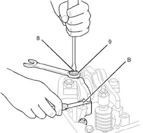 a松開進氣門搖臂上的鎖緊螺母(9)。