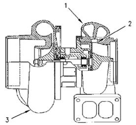 1檢查渦輪有無異物造成的損壞。如有損壞應確定異物的來源。更換渦輪增壓器(3)。如果沒有損壞請進行步驟2。