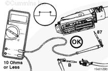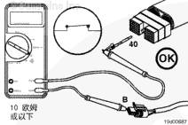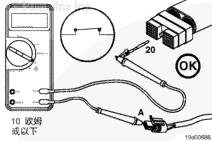 測量電阻。萬用表 必須顯示為閉路(10 歐姆或更小)。如果測量結果大于 10 歐姆,回路電源導線中存在開路。維修導線,或更換線束。參考 OEM 故障診斷及排除手冊。