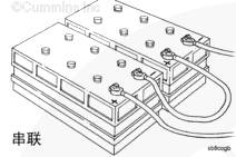 插圖所示為一種典型的蓄電池串聯連接。這種連接中,正極 (+) 和負極 (-) 相接,可以得到雙倍的電壓。
