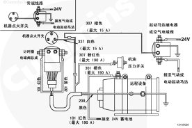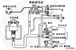 只有 L10/M11/N14/K19/QSK19/QST30/V28 發動機需要一個起動馬達。參考單起動馬達電氣接線圖。