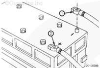 蓄電池可能會有易爆性氣體逸出。為了盡可能避免人身傷害,在維護蓄電池前,必須保持發動機艙通風良好。為避免產生電弧,應最先拆下并最后連接蓄電池負極 (-) 電纜。