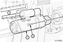 L10/M11/N14 整體式 PRELUB™ 起動馬達,拆卸起動馬達 (1) 的電氣接頭 (3), 并標識它們的位置。拆下 3 顆螺栓 (2) 和現有的起動馬達 (1)。保留螺栓。