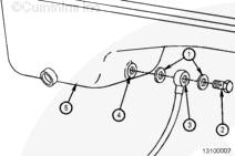 把一個銅密封墊圈 (1) 放在空心螺栓上 (2)。把空心螺栓插到空心管接頭內 (3)。將其他銅密封墊圈 (1) 放到空心螺栓/空心管接頭總成中。將空心螺栓/空心管接頭總成插入到油底殼 (5) 的回油側 (4)。扭矩值:  88  n.m  [65 ft-lb]