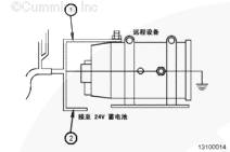 遠程 PRELUB™ 泵導線,連接紅色導線 (1) 和起動馬達端子。連接橙色導線 (2) 到一個 12VD C  或者 24VD C  蓄電池接頭。