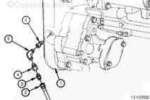 康明斯L10/M11 壓力管安裝,如果使用備用位置,確保它是一個臟的機油端口。從機油濾清器座 (1) 前面拆下螺塞 (2)。