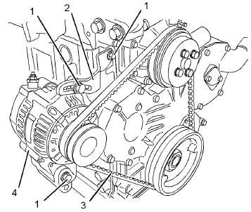 2. 移動(dòng)交流發(fā)動(dòng)機(jī)(4)以增加或降低皮帶張緊度。檢查皮帶張緊度時(shí),應(yīng)在兩個(gè)皮帶輪中間的地方施加45 N (10 lb ft)的力。調(diào)整正確的皮帶將下垂10 mm (0.39 inch)。