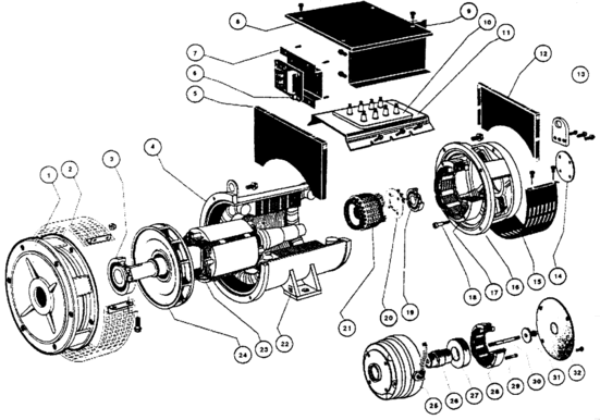 1 - front cover;2, a wind cover plate;3 - bearing;4 - stator;5 - terminal box side plate;6, voltage regulator;7 - regulator bracket;8 - terminal box cover;9 - terminal box front plate;10 - terminal plate;11 - wiring board bracket;12 - terminal the side box;13, a lifting;14 - bearing cap;15 - air inlet cover;16 - rear cover;17, the stator of the exciter;18, the stator of the exciter fixing bolt;19 - bearing;20 - rotating rectifier;21, the exciter armature;22 - Grounding card;23, the rotor;24 - fan;25 - permanent magnet machine;26 - permanent magnet machine rotating shaft;27 - permanent magnet machine rotor;28 - permanent magnet machine stator;29 - permanent magnet machine stator fixing bolt;30 - permanent magnet machine rotor retaining bolt;31 - washer;32 - permanent magnet machine cover