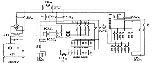 在每一個(gè)充電回路應(yīng)設(shè)有防止逆流的逆電流繼電器或二極管,當(dāng)主應(yīng)急電網(wǎng)都失電時(shí),接觸器ZC1線圈失電,常閉觸頭閉合,直接向小應(yīng)急用電設(shè)備供電,其余用電設(shè)備分別利用開關(guān)送電。