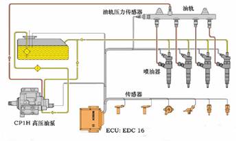 •         共軌系統(tǒng)的高壓部分被分成高壓發(fā)生器(高壓泵)、壓力蓄能器(共軌管)和燃油計量元件(電磁閥)。 主要的零部件:配有電磁閥的高壓油泵(CP1H型) 、共軌管、共軌壓力傳感器、噴油器。