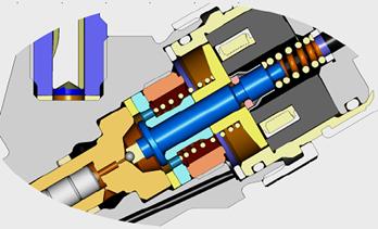 當噴油器的電磁閥被觸發(fā),泄油孔被打開,這引起控制腔的壓力下降,結(jié)果,活塞上的液壓力也隨之下降,一旦液壓力降至低于作用于噴油嘴針閥承壓面上的力,針閥被打開,燃油經(jīng)噴孔噴入燃燒室。這種對噴油嘴針閥的不直接控制采用了一套液壓力放大系統(tǒng),因為快速打開針閥所需的力不能直接由電磁閥產(chǎn)生,所謂的打開針閥所需的控制作用,是通過電磁閥打開泄油孔使得控制腔壓力降低,從而打開針閥。