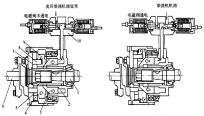 1 – 凸輪軸  2 – 液壓腔  3 – 液壓活塞  4 – 大偏心輪  5 – 小偏心輪  6 – 驅(qū)動軸 7 – 驅(qū)動盤   8 – 滑塊銷  9 – 滑塊  10 – 電磁閥