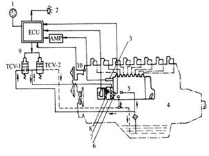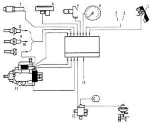 1 – 轉(zhuǎn)速表  2 – 故障指示燈  3 – 供油齒條位置傳感器  4 – 柴油機(jī)  5 – 噴油泵  6 – 正時(shí)傳感器  7 – 正時(shí)控制閥  8 – 轉(zhuǎn)速傳感器  9 – 正時(shí)控制電磁閥  10 – 冷卻液溫度傳感器