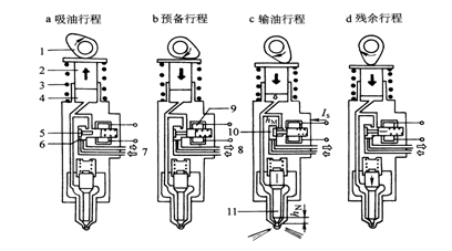1-凸輪 2-柱塞 3-回位彈簧 4-高壓腔 5-電磁閥針閥  6-電磁閥閥腔 7-進(jìn)油通道 8-回油通道 9-線圈 10-低壓腔